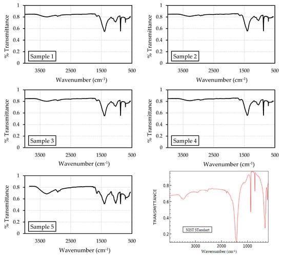 The FT-IR evaluation proved the presence of calcium carbonate in the crystal, which is related to calcium carbonate precipitation produced by bio-based materials. Figure 8 depicts the FT-IR spectra for the precipitate in the test tube. For sample 1, the peaks at 1392.35 cm−1, 1031.73 cm−1, and 871.667 cm−1 demonstrated the existence of calcium carbonate. For precipitates of samples 2 and 3, the signals at 1403.924 cm−1, 1033.658 cm−1, and 871.67 cm−1 showed the presence of calcium carbonate. A comparable trend was observed in the pattern for sample 4, which showed peaks at 1392.35 cm−1, 1031.73 cm−1, and 871.667 cm−1. The precipitate for sample 5 was CaCO3, as demonstrated by the peaks at 1394.281 cm−1, 1029.801 cm−1, and 871.67 cm−1. These spectra were analyzed and aligned with the standard spectrum of calcium carbonate from the National Institute of Standards and Technology (NIST) Standard Reference Database [33]. Therefore, this spectrum showed that the majority of precipitate was composed of calcium carbonate.