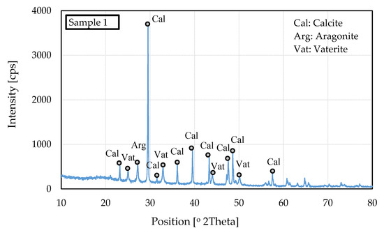 Based on the XRD analysis, the three polymorphs of CaCO3 (calcite, vaterite, and aragonite) coexisted. Calcite was the main polymorph, with nine peaks. There was only one peak of the aragonite polymorph in the precipitate, showing that the calcium carbonate precipitate was stable because calcite is the stable polymorph of the crystal. In addition, the XRD method showed the effect of the changes in temperature [30]. When temperature increased, the intensities of the calcite reflections increased and became the major phase. The XRD analysis emphasized that calcite should be the dominant polymorph of calcium carbonate.
