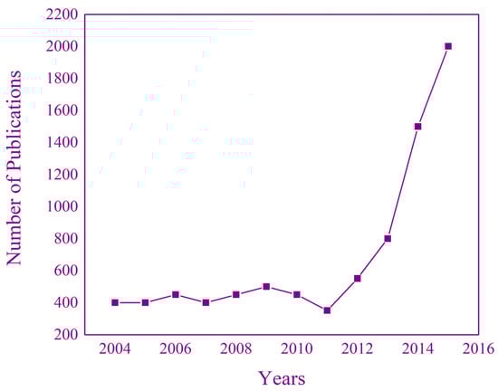 The number of publications for 2D materials reporting from 2004 to 2014 [12].