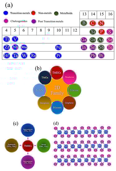 Layered 2D transition metal dichalcogenides contain a prodigious number of crystals and are represented by the general formula of MX2 where M is a transition metal from groups IV B, V B, VI B, VII B (Ti, Zr, Hf, V, Nb, Ta, Mo, W, Tc, Re) and X is a chalcogen element from group VI A (S, Se, Te) [4,24,25]. Figure 2b shows the general classification of 2D family. Depending upon the layer number, elemental conjunction, and presence or absence of dopant, TMDs exhibit a bandgap ranging from 0 to 2 eV, unlike the pure graphene which is a semimetal with 0 eV bandgap [21,23,26].