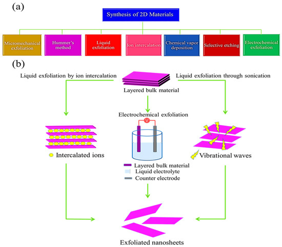 There are a number of methods for synthesis of 2D materials, as listed in Figure 3a, including: Hummer’s method [48], micromechanical cleavage [1,49,50], liquid exfoliation [51] assisted by ion intercalation [52,53,54,55] and mechanical force [47,56,57,58,59], oxidation assisted liquid exfoliation [17,49,60], chemical vapor deposition [61,62,63,64,65], wet chemical synthesis method [66,67,68,69], electrochemical exfoliation [70,71,72,73,74], ball milling [51,75], etching-assisted exfoliation etc. [76,77,78]. All these methods can be grouped in two major classes of top-down and bottom-up approaches.