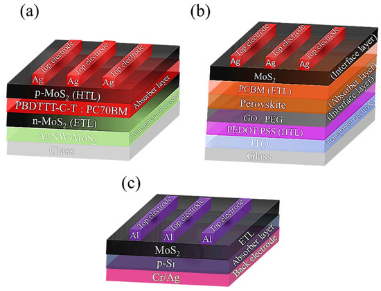 (a) An easy sketching of glass/AgNW-MoS2/n-MoS2/PBDTTT-C-T:PC70BM/p-MoS2/Ag based organic solar cell [226]. (b) ITO/PEDOT:PSS/GO/perovskite/PCBM/MoS2/Ag based perovskite solar cell [230]. (c) MoS2/p-Si based heterojunction solar cells [231].