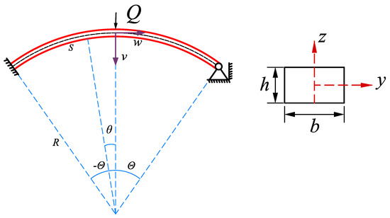 The FG-GPLRC arch, shown in Figure 2, with pinned-fixed end, arc length S, central angle , cross section b × h, subjected to central point load Q is investigated.