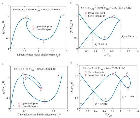 Figure 4 shows the multiple equilibria and buckling of the pinned-fixed FG-X-GPLRC arch in the form of load-displacement curve and load-axial force curve. It can be seen that, when the pinned-fixed FG-X-GPLRC arch has (Figure 4a,b), there is no limit point on its non-linear equilibrium path, which means that the pinned-fixed FG-GPLRC arch cannot buckle under the central point load. When the arch has (Figure 4c,d), there are two limit points (b and c) and three branches (ab, bc and cd) on the non-linear equilibrium paths. When the arch has (Figure 4e,f), there are four limit points (b, c, d and e) and five branches (ab, bc, cd, de and ef) on the non-linear equilibrium paths. Hence, it can be concluded that the special arch geometric parameter and can be used as a switch between arches with two or four limit points and those without limit point. It is worth pointing out that no matter how the increases, if , there are four and only four limit points on the non-linear equilibrium path. It also can be observed from Figure 4c–f that the curve on both sides of the upper limit point is concave downwards with the slopes changing from positive to negative, whereas the curve on both sides of the lower limit point is concave upwards with the slopes changing from negative to positive. The deformed shape of the arch under limit point load has a greater change in curvature.