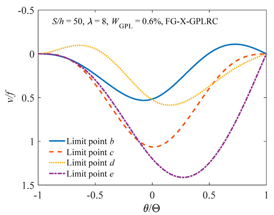 In addition, Figure 5 presents the typical radial displacement distributions along the arch length for the pinned-fixed FG-X-GPLRC arch with , in which the distributions correspond to the limit points b, c, d and e indicated in Figure 4e,f. As expected, all distributions of the displacements are unsymmetrical.