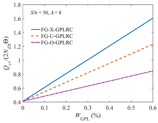 Taking the first upper limit point as the limit point buckling load, the limit point buckling loads of FG-X-GPLRC arches with different geometry are listed in Table 2. It is found that the FG-X-GPLRC arch has the highest limit point buckling load, and the cracked FG-X-GPLRC beam has the smallest one. This is because the FG-X-GPLRC arch with more GPLs filler dispersed in the top and bottom layers possesses a higher bending stiffness and consequently has a higher buckling load. In addition, Figure 6 plots the buckling load of FG-GPLRC arches with varying weight fraction WGPL, and shows that the buckling load of FG-GPLRC arches are much higher than that of pure epoxy arch (WGPL = 0.0%) in all cases, which indicates the remarkable reinforcing effect of GPLs.