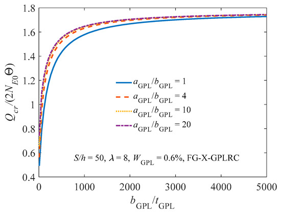 Figure 7 presents the influences of GPL geometry on the limit point buckling load of the FG-X-GPLRC arch with the GPL width-to-thickness ratio bGPL/tGPL increasing from 10 to 5000. According to the Equations (1)–(3), GPL with higher value of width-to-thickness ratio and aspect ratio have a more significant enhancing effect on the effective elastic modulus of GPLRC. Therefore, the buckling load increases when GPL width-to-thickness ratio or aspect ratio increases, but the effect of GPL geometry tends to be insignificant when bGPL/tGPL > 1000 and bGPL/tGPL > 4, respectively.