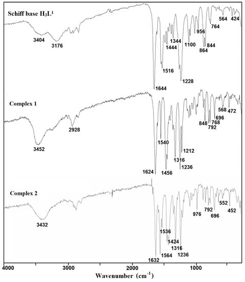 Fourier transform infrared (FTIR) spectra of the Schiff base ligand H3L1 and complexes 1 and 2.