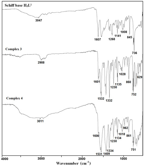 FTIR spectra of the Schiff base ligand H3L2 and complexes 3 and 4.