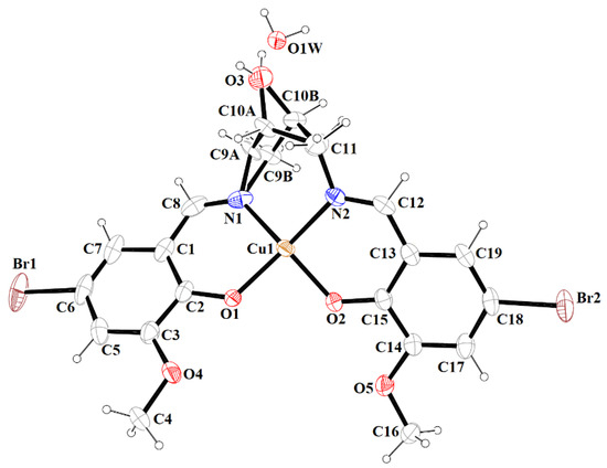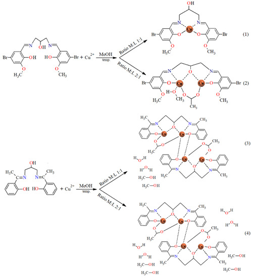 Herein, we report the crystal structures, thermal, and spectral properties of four new Cu(II) Schiff base complexes. In the research, we used two Schiff bases as ligands that differed in the amount and kind of substituents in the benzene ring (Scheme 3). 2,2′-{(2-hydroxypropane-1,3-diyl)bis[nitrilomethylidene]}bis(4-bromo-6-methoxyphenol) H3L1, possessing two imino nitrogen atoms, two phenolic oxygen atoms, one alcoholic oxygen atom, and two oxygen atoms of the methoxy groups, can potentially act as a seven-coordinated ligand. 2,2′-{(2-hydroxypropane-1,3-diyl)bis(nitriloeth-1-yl-1-ylidene)}diphenol H3L2 with two imino nitrogen and three oxygen (phenolic and alcoholic) atoms can react as a five-coordinated ligand.