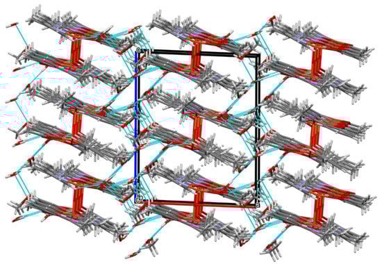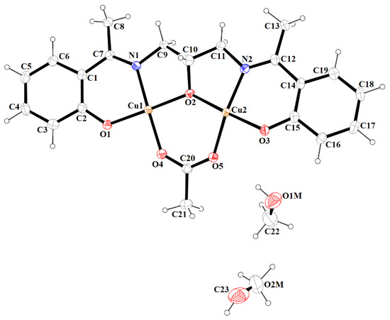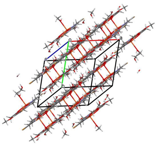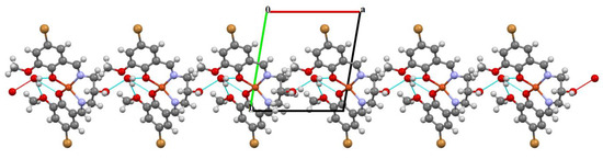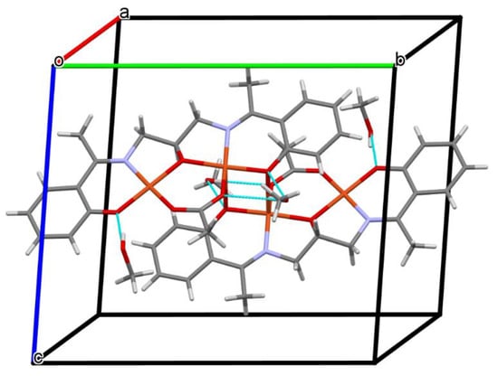 Complex 3 crystallizes in the centrosymmetric monoclinic space group P21/n. Single-crystal X-ray analysis showed that the asymmetric unit of 3 contains two crystallographically independent Cu(II) centers, one deprotonated Schiff base ((L2)3‒), the acetate ion, and two methanol molecules (Figure 7). Both CuII ions are coordinated by one phenoxy, alkoxy, and carboxylate oxygen and imine nitrogen atoms. Additionally, the Cu(2) ion is bound by the phenolate oxygen of second (L2)3‒ ions, which leads to the formation of a tetranuclear complex. The Cu(1) atom resides in an almost perfect square planar environment that was confirmed by the values of the τ4 and τ4’ parameters [42,43], which were equal to 0.05 and 0.04, respectively. In contrast to complex 2, the coordination polyhedron around the Cu(2) ion was a significant distorted square pyramid (τ5 = 0.26) [44]. The Cu–O and Cu–N bonds were within the normal values and were comparable to those observed in the related copper(II) complexes [3,32,45]. The dimeric units [Cu4(L2)2(OAc)2] and methanol molecules were consolidated by the O–H···O hydrogen bonds (Figure 8). The presence of weak C–H···O interactions connects the discrete units into a layered structure (Figure S8).