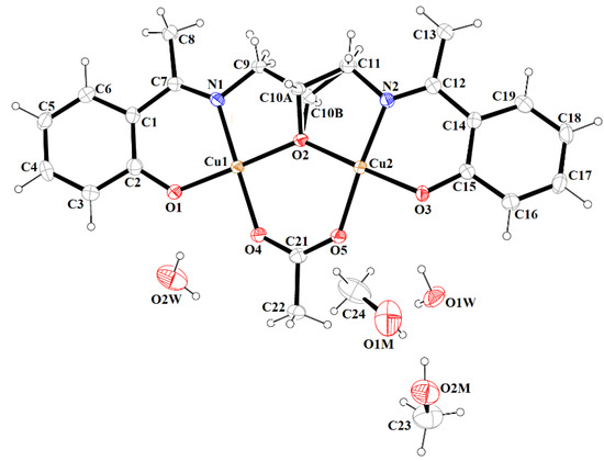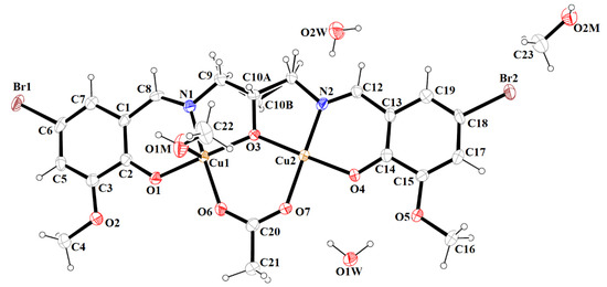 The reagent grade chemicals (i.e., 1,3-diamino-2-propanol (97%), 5-bromo-2-hydroxy-3-methoxybenzaldehyde (98%), 2′-hydroxyacetophenon (99%), Cu(CH3COO)2·H2O (98%), and methanol (99.8%)) were purchased from commercial sources and used as received without further purification.