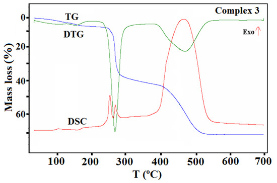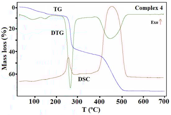 The thermal properties of complexes 1–4 were studied in an air atmosphere and the thermogravimetric (TG), the differential thermal analysis (DTG) and the differential scanning calorimetric (DSC) curves and TG-FTIR spectra are presented in Figure 11, Figure 12, Figure 13, Figure 14, Figure 15 and Figure 16, Figures S9 and S10.