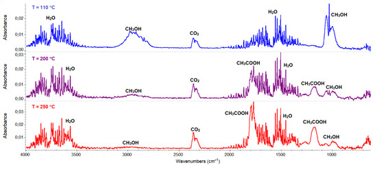 The thermal behavior of complex 3 was also studied in the inert atmosphere of nitrogen. The first stage was similar to that observed in air (i.e., desolvation process). In contrast to the oxidizing atmosphere, a smaller amount of solvent (one and half molecule, found mass loss 4.1%) was released. The remaining methanol molecules were removed from the complex together with the acetate ions, which was confirmed in the FTIR spectra of the gaseous products. The characteristic vibration bands of CH3OH were observed in the wavenumber ranges between 2750–3150 and 950–1100 cm−1, together with those assigned to the acetic acid and their products of the pyrolysis (i.e., CO2 and H2O) (Figure 15). The further heating of the sample was related to the pyrolysis of the Schiff base ligand, which led to the formation of the following gaseous products: CO2, NH3, H2O, C6H5OH, and CO [46].