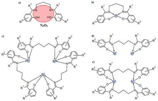The N2O2-donor Schiff base ligands of 1,3-diaminopropane and o-hydroxy aromatic ketones/aldehydes (a) and their possible coordination modes (b–e).