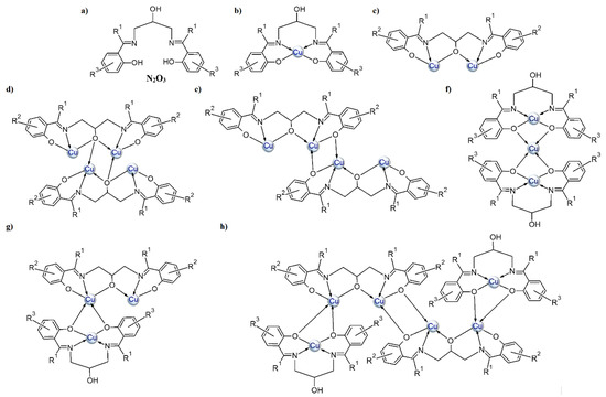 General depiction of the structures that bis o-hydroxy Schiff bases of 1,3-diamino-2-propanol and o-hydroxy aromatic ketones/aldehydes adopt with copper(II) ions: (a) imine ligand, (b–h) the possible coordination modes.