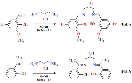 The Schiff base H3L2 was synthesized from 2′-hydroxyacetophenon (1.36 g, 10 mmol) and 1,3-diamino-2-propanol (0.45 g, 5 mmol) in hot methanol (50 mL) according to the literature [3,32].