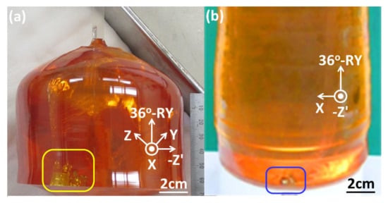 36°-RY LiTaO3 single crystals in which twinning takes place beneath (a) +X and (b) −Z’ surfaces. The visible twinned region in each crystal is indicated with the rounded rectangle.