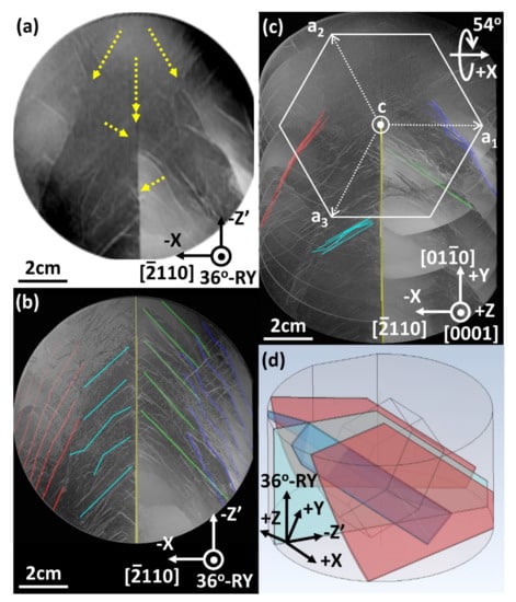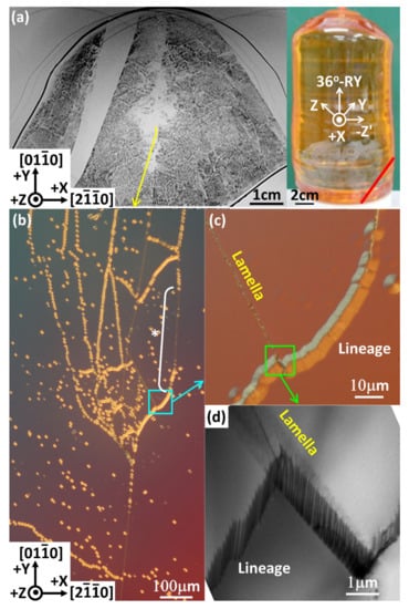 In a series of 36°-RY wafers cut from single crystals free from cracks and/or twin domains, lineages are observed as almost straight lines by X-ray topography (e.g., Figure 2a). Five kinds of lineages expanding along different planes, of which the location varies in each wafer, are typically observed. Figure 2b shows the reconstructed 3D X-ray topograph of the lineages projected along the pulling direction. Except for the lineage normal to the X axis (indicated with the double arrow in Figure 2a), the other lineages are inclined from the pulling direction. Meanwhile, all lineages are observed edge on when the 3D topograph is observed along the Z axis (Figure 2c), indicating that they are parallel to the Z axis. They would nucleate nearby the +Z’ surface at the vertex of the angle defined between the shoulder and the body, at which large thermal stress would be generated []. They expand roughly along three {} planes of (), (), and (), and two {} planes of () and (), as the crystal grows. Those lineages are, therefore, preferentially arranged to form a mirror symmetry to the () plane passing through the central axis of the crystal, as schematically shown in Figure 2d. This symmetry is the same as the crystallographic symmetry on the 36°-RY plane. Similar 3D distribution of lineages with the mirror symmetry is observed even in the monocrystalline parts in twinned crystals, as shown in Section 3.2.