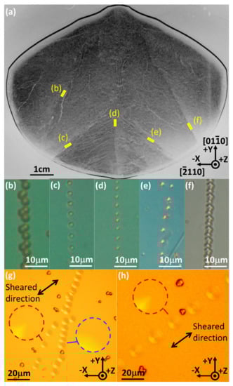 (a–g) DIC micrographs of dislocation etch pits in a {} lineage at different wafer orientations with respect to the fixed sheared direction, on an etched () surface schematically shown in (h).