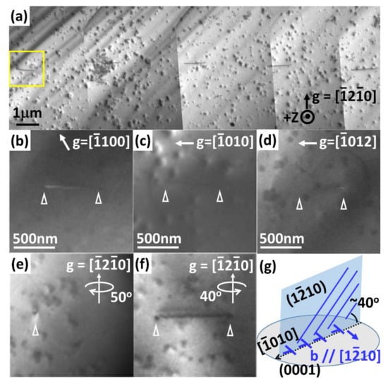 The () lineage shown in Figure 3c is composed of a set of dislocations arranged at similar intervals of about 5 μm (Figure 4a). The dislocation lines are observable by dark-field (DF-) TEM (e.g., Figure 4b), except when the Burgers vector b is normal to the reflection vector g [], e.g., for g = [] (Figure 4c) and [] (Figure 4d). The Burgers vector is, therefore, either 1/3[] or 1/3[]. This result indicates that the dislocations are not dissociated into pairs of partial dislocations of the ⟨⟩-type, as observed in some as-grown crystals []. Dissociation of dislocations, reported for the dislocations introduced intentionally on (0001) in a LiTaO3 bicrystal [], is not observed. Dislocations on pyramidal planes with b = 1/3⟨⟩ or 1/2⟨⟩ (so-called pyramidal dislocations), introduced frequently during the CZ growth with the pulling direction of [0001] [,,,], are not observed.