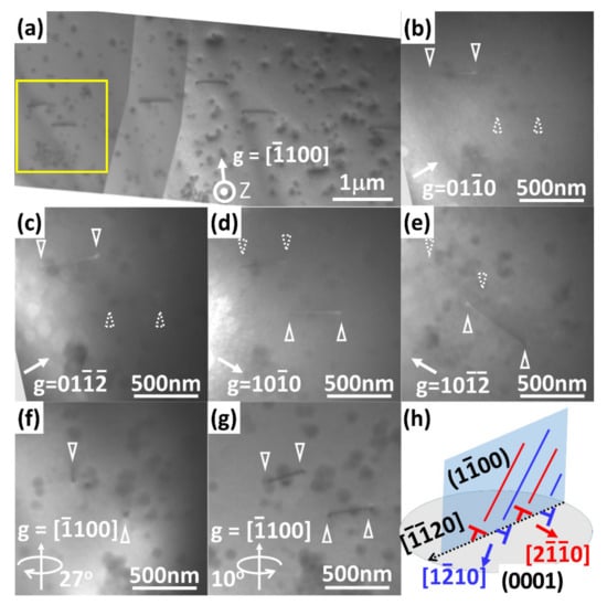 (a) Low magnified BF-TEM image of a {1-100} lineage. (b–e) DF-TEM images of the dislocations in the square in (a), taken with g indicated in each figure. (f and g) Stereoscopic BF-TEM images of the dislocations, taken with g = [] and s < 0 with the incident direction indicated in each figure. (h) Schematic view of the {} lineage in (a).