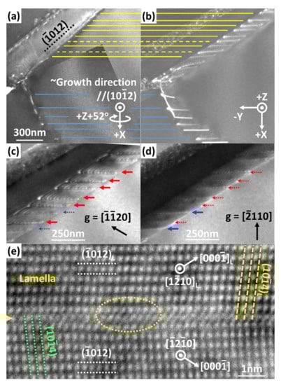 Figure 7a,b show stereo microscopy of the lamella and lineage shown in Figure 6c, indicating that the lamella propagates on the () plane. Some dislocations in the lineage would propagate on the lamella and their extension direction is close to the growth direction. The other dislocations nearby the lamella also extend to the similar direction. DF-TEM reveals that the Burgers vector of the dislocations on the lamella differs from that of the dislocations observed in single crystals without twinning (i.e., b = 1/3⟨⟩). Most of the dislocations on the lamella, indicated by red arrows in Figure 7c, have the Burgers vector nearly normal to [], as they are scarcely observed when g = [] (Figure 7d). Meanwhile, the Burgers vector of the other dislocations, indicated by blue arrows in Figure 7d, is nearly normal to [], as they are invisible when g = [] (Figure 7c).