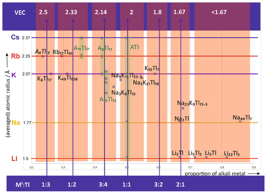In general, all alkali metal thallide compounds, which will be discussed in the following, have been obtained experimentally by the respective groups by applying classical solid state techniques. To get an overview of the alkali metal thallide compounds, a map is arranged (Figure 1) in which the values of the averaged alkali metal radii are used as the ordinate; the abscissa is given by the values of the alkali metal proportion of the corresponding structure. The green areas highlight the parts of the diagram, where one structure type is known for different alkali metals. In contrast, there are structure types, which are unique for a certain alkali metal. For example, at a VEC of approximately 2.33, K49Tl108 is reported, whereas for rubidium and cesium this structure type could not yet be realized but instead A15Tl27 (A = Rb, Cs) is known (see Section 3).