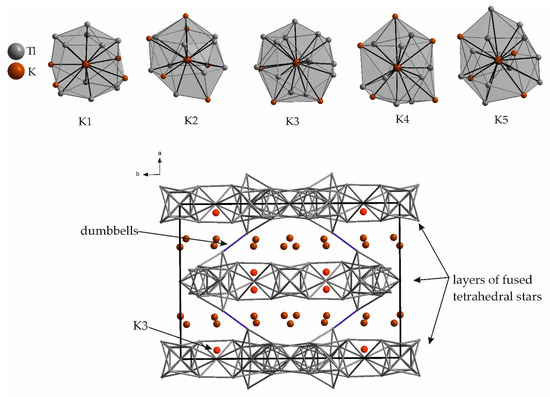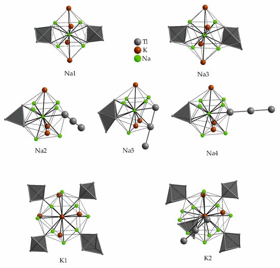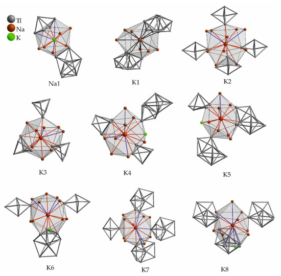K6Tl17 [34] represents the thallium richest alkali metal thallide compound of which a crystal structure has been reported so far. K6Tl17 features a VEC of 2.48 and crystallizes in the space group Cccm. The compound consists of two crystallographically independent Tl12 units and additional Tl2 dumbbells. The Tl12 units are present in terms of tetrahedral stars, which are well-known characteristics of electron poor intermetallics (VEC 2.1–2.6) [36]. These tetrahedral stars are condensed by forming two-dimensional layers, which are interconnected by the Tl2 dumbbells. The result is a three-dimensional network of thallium atoms with Tl-Tl distances between 3.190(2) Å and 3.711(4) Å. This is a rather rare arrangement for alkali metal thallides, as with K49Tl108 [37,38] and Rb17Tl41 [39] only two other examples for three-dimensional Tl substructures are known. The remaining thallide structures are lower in Tl–Tl dimensionality. The alkali metals in K6Tl17 are located on five different crystallographic sites. The number of contacts to thallium and potassium atoms within a given distance is given in Table 1. The altogether number of neighboring atoms within the given distances calculates from 14 to 17. K3 represents the most densely coordinated alkali metal in K6Tl17. In Figure 2, the surroundings of the symmetry inequivalent potassium atoms are given.