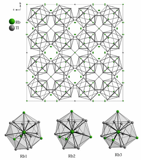 - Dong, Z.C.; Corbett, J.D. A15Tl27 (A = Rb,Cs): A structural type containing both isolated clusters and condensed layers based on the Tl11 fragment. Syntheses, structure, properties, and band structure. Inorg. Chem. 1996, 35, 1444–1450. [Google Scholar] [CrossRef]