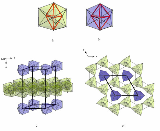 The VEC of ~2.33 again falls within the range of the tetrahedral star regime (see Section 2, K6Tl17), and indeed for A15Tl27 (A = Rb, Cs) [35] the structural motif of double tetrahedral stars (DTS) is observed. Figure 4 shows parts of the crystal structure of Rb15Tl27 as representative for the A15Tl27 structure family. This compound includes two different DTS units. Figure 5a shows the DTS arrangement, which is further condensed by forming (Tl6/2Tl3/1Tl2/1)2 (≡Tl16) layers (green in Figure 5c,d). The second distorted DTS unit is represented by isolated Tl117− clusters (point group D3h, Figure 5a), which are located below and above the large pores of the layers (blue, Figure 5c,d).