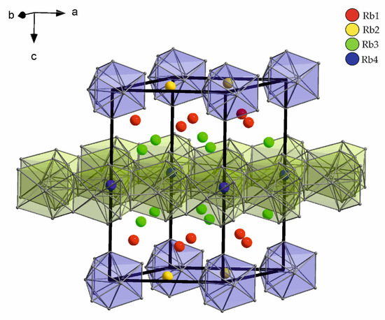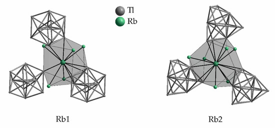 A8Tl11 binary phases (A = K, Rb, Cs) [46,47] crystallize in the K8In11 type structure (space group R-3c) [48]. The anionic moiety is represented by a Tl11 cluster, but in contrast to their highest possible symmetry (D3h in A15Tl27; see Section 3.2), here only D3 symmetry for the Tl11 unit is realized, according to their site symmetry. The substitution of the extra electron in A8Tl11 by halide results in A8Tl11X, in which a less degree of distortion of the Tl117− cluster is observed, electronic effects of the extra electron therefore cannot be excluded [49]. Due to the high symmetry of the crystal structure, only two symmetry inequivalent alkali metal sites are present in A8Tl11. In Table 5, the number of contacts and the corresponding distances to thallium as well as rubidium in Rb8Tl11 as representative for all A8Tl11 structures are given. While Rb2 shows contacts to altogether 15 atoms within 4.6 Å, Rb1 exhibits only 12 surrounding atoms (Figure 7). This makes the position of Rb1 conspicuous and indeed, having a closer look at the crystal structure, this position is involved in the formation of a distorted octahedral arrangement around a void. This void can be filled by halide yielding an enlarged number of surrounding atoms of Rb1 of 13 [49]. In general, for binary A8Tl11 no site occupancy preferences for different alkali metals have been reported.