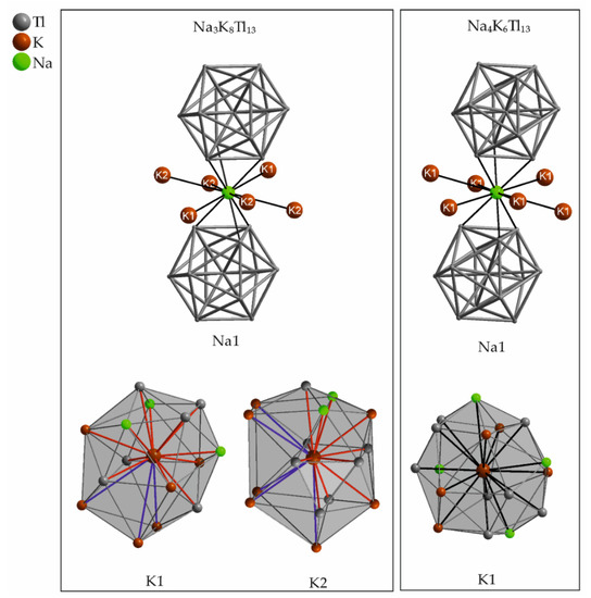 In 1994, Corbett et al. demonstrated on the basis of the compound Na2K21Tl19 [50] (see Section 5.3) that the involvement of different alkali metals within one thallide compound had a significant influence on the formed crystal structure. They also introduced this concept at a ratio of 3:4 of MI:Tl and subsequently reported on Na4A6Tl13 (A = K, Rb, Cs) and Na3K8Tl13 [51]. According to the A8Tl11 compounds, we would expect isolated clusters in this area of the VEC. In fact, centered, icosahedral shaped Tl13 clusters are found when sodium and additionally a heavier congener are mixed. The shape of the open-shell Tl1310− clusters in Na4A6Tl13 is not significantly changed for closed shell Tl1311− in Na3K8Tl13, but the overall structure changes from former bcc (body-centred cubic) packing of Tl1310− clusters in Na4A6Tl13 into pseudo fcc (face-centred cubic) packing of formal Tl1311− in Na3K8Tl13. The number of sodium atoms of the first coordination sphere of the clusters is reduced from eight in Na4K6Tl13 to six in Na3K8Tl13. A loss of electronic reasons for the formation of open shell Tl1310− emphasizes the dominant effects of packing requirements [47]. The presence of sodium is essential for the formation of these compounds. All attempts to prepare a compound including Tl1310/11− in absence of sodium have not yet succeeded. In addition, the replacement of potassium by larger alkali metals rubidium or cesium did not result in Na3A8Tl13 but always in Na4A6Tl13. Significant differences between Na4K6Tl13 and Na3K8Tl13 become apparent, when comparing the adjacent atoms and the corresponding distances of the alkali metals (Table 6 and Table 7). The distorted icosahedral coordination of the sodium cations by 6 Tl atoms and 6 potassium neighbors virtually is the same in both compounds (Figure 8). The value for the Na1–K1 distance of 4.168(2) Å in Na4K6Tl13 is longer than both Na–K distances found in Na3K8Tl13 (d(Na1–K1 = 3.638(6) Å; d(Na1–K2) = 4.076(6) Å).