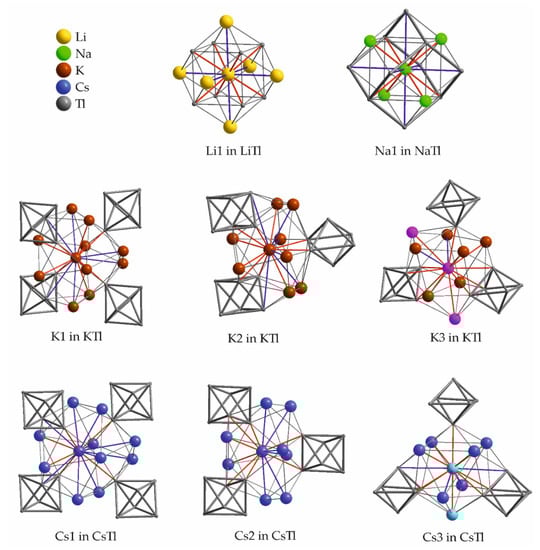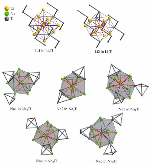 Figure 9 shows the surroundings of the symmetry inequivalent alkali metals in ATl (A = Li, Na, K, Cs), thereby, the shorter distances are given in red, the longer are colored blue. According to the β-brass type structure, the altogether number of neighboring atoms of Li in LiTl sums up to 14, of which 8 Tl atoms are at short distances below 3 Å in a cubic arrangement. Six additional coordinating atoms are found at a Li–Li distance of 3.5 Å, which is significantly elongated, compared to the Li–Li distance of 3 Å in the bcc unit cell of elemental Lithium [61].
