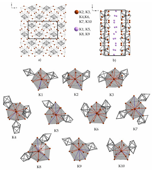 The composition of K10Tl7 [64] is unique for potassium as in this area of VEC no other alkali metal thallide is known so far. K10Tl7 also represents the potassium-richest binary thallide phase. The included polyanionic species is, according to MO (molecular orbital) extended Hückel calculations, represented by a pentagonal bipyramidal, hypocloso Tl77− anion. Additionally, three extra electrons are present which allow for the favored composition for an effective packing of Tl77− anions and potassium cations. The geometry of the anion is close to D5h, the crystallographic symmetry is C1 as all atoms lie on general positions of the space group P21/c. The potassium atoms are also located on general positions around this anion. The number of surrounding atoms and the respective distances of the potassium atoms are given in Table 14. The coordination numbers are between 11 and 15, if distances up to 5 Å are taken into account. At farther distances up to 5.5 Å, the coordination number is 13 to 15. The potassium atoms can be subdivided into two groups concerning their role in the overall crystal structure. Six cations (red: K2, K3, K4, K6, K7, and K10) connect the clusters to form layers, while the remaining (pink: K1, K5, K8, and K9) are situated between these layers and connect them to form a three-dimensional network (Figure 12). The surroundings of all ten symmetry inequivalent potassium atoms are given in Figure 12. The coloring of the contacts refers to the given range of distances in Table 14. The perceivable surrounding of K3 is worth mentioning, as 15 neighbors at comparably small distances (6 × K–Tl (<4 Å); 9 × K–K (<4.7 Å)) form the smallest cavity within the crystal structure of K10Tl7.