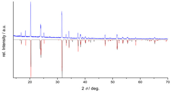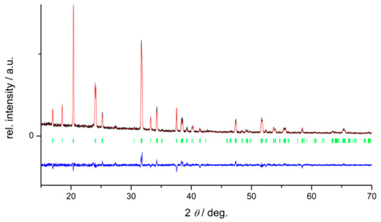 X-ray diffraction on the microcrystalline powder (PXRD) was performed on a STADI-P (Stoe & Cie GmbH, Darmstadt, Germany) equipped with a position sensitive detector and copper Kα-radiation (λ = 1.5406 Å). The data were processed with the program WinXPow™ (version 3.0.1.13, Stoe & Cie GmbH, Darmstadt, Germany) and Rietveld refinements were carried out using the FULLPROF 2.05 program [23]. A visualization of the resulting structures was done with the program Diamond 4.0 (Crystal Impact GbR, Bonn, Germany).