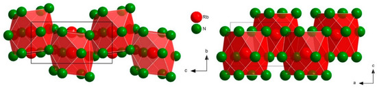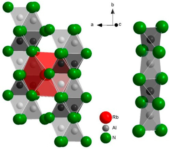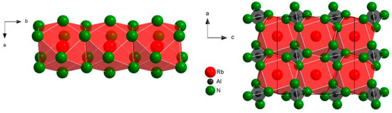 Within the tetragonal structure, the cuboctahedra around rubidium are connected by face-sharing parallel to the c-axis, therefore forming strands. The already mentioned [Al(NH2)4]−-tetrahedra are found in layers parallel (110), alternating in edge- and corner-sharing with the cuboctahedra. In the monoclinic modification, in contrast, there are layers composed of two corner-sharing tetrahedra as well as two edge-sharing with the cuboctahedra which extend parallel to the b-axis in (101) (Figure 5). The cuboctahedra surrounding rubidium show the same face-sharing as in the P4/n modification, although parallel to the b-axis (compare Figure 3). Furthermore, they are connected via edge-sharing orthogonal to the b-axis, similar to the tetragonal structure.