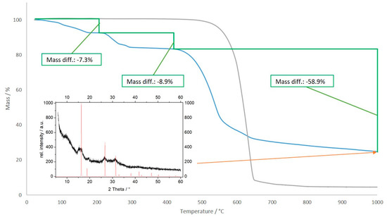 To further study the decomposition behavior of the amidoaluminate under increased temperature, thermal gravimetric experiments (TG) were conducted on the obtained microcrystalline powder. When using a heating rate of 10 K/min up to 1000 °C, three steps of decomposition are observed (Figure 7). The first two steps occur up to 200 and 350 °C, respectively, with a loss of mass around 8% each. Here, most likely, ammonia is leaving the compound, resulting in condensation products like Rb2[Al2(NH)2(NH2)4] first, followed by the formation of AlN and RbNH2. To further investigate these steps, another part of the sample was heated in a glass tube under argon atmosphere so as to visually observe the transitions. When reaching temperatures above 300 °C, liquefying was detected, which continued until around 350 °C, at which, visually, a liquid in the glass aperture could be observed. Additionally, the color changed, gradually getting darker to brown and later even to a black substance. When heating above 350 °C, the liquid starts to release gas, indicted by small bubbles, and solidifies again, with a concomitant significant decrease in volume. Similar liquefying under the release of ammonia was earlier reported for Na[Al(NH2)4] [27]. Intermediates in the ammonobasic GaN synthesis with amides of the heavier alkali metals K–Cs typically are obtained as liquids with variable ammonia content and the tendency to solidify after time [11].
