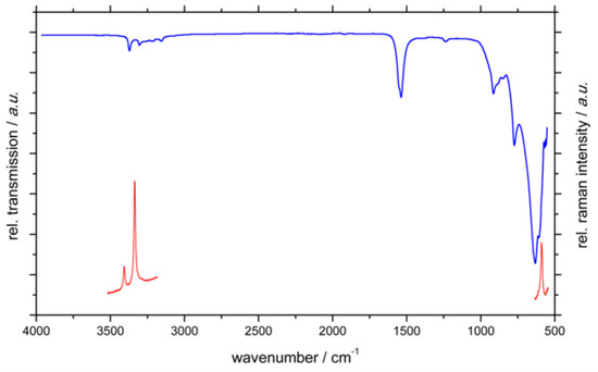 As expected, the infrared (IR) spectroscopy conducted on the new modification of rubidium tetraamidoaluminate shows little difference to the reported data for the tetragonal modification in P4/n [18]. This is not surprising considering that the only difference lies in the alignment of the tetrahedra, while the main structure motifs are unchanged but for distortion. The observed signals of IR and Raman spectroscopy have been summarized in Table 4 in comparison to the literature data for the tetragonal modification. Furthermore, a graphic representation of both the measured IR spectrum as well as segments from the Raman spectrum is shown in Figure 8.