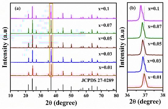 Figure 3a shows the representative XRD patterns of Li2CaGe1−xCrxO4 (x = 0.01, 0.03, 0.05, 0.07, and 0.1), along with the corresponding standard XRD pattern of Li2CaGeO4. All of the diffraction peaks of the as-prepared samples can be matched well with the data of pure Li2CaGeO4 (JCPDS 027-0289). According to the XRD analysis, the upping of Cr4+ ions in the studied concentration did not cause any phase transition or a new phase of the crystal structure. However, the XRD patterns of the Cr4+-doped samples showed regular changes, as evidenced in Figure 3b. With the increase in the Cr4+ doping concentrations, the leading peak compared to the peak of doped Li2CaGeO4 gradually shifted to a low 2θ angle. This change is due to an increase in the number of Cr4+ ions to replace the Ge4+ sites. This phenomenon also confirms that the Cr4+ ions successfully entered the crystal lattice of Li2CaGeO4 and substituted the Ge4+ ions. According to the Bragg equation (Equation (1)):