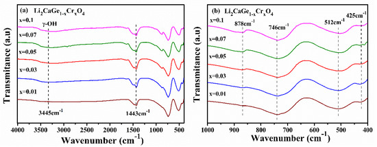 The Fourier infrared spectra of Li2CaGe1−xCrxO4 (x = 0.01, 0.03, 0.05, 0.07, and 0.1) are shown in Figure 4. Figure 4a shows the FT-IR spectra in the range of 4000–400 cm−1. It can be seen from the figure that the vibration absorption bands of all samples are basically the same, which proves that the main lattice structure of the doped crystals did not change, which corresponds to the XRD analysis of the Li2CaGe1−xCrxO4 crystals. The main vibration absorption bands of the sample were concentrated in the range of 1000–400 cm−1, and in the range of 4000–1000 cm−1, there were mainly two absorption peaks at 3445 and 1443 cm−1; the vibration absorption band at 3445 cm−1 is a typical characteristic of hydroxyl stretching (γ-OH), while the absorption band at 1443 cm−1 is the absorption band of the OH vibration absorption of water and CO32− of CO2 in the air [28]. Figure 4b shows the FT-IR spectra of the absorption bands in the range of 1000–400 cm−1. In this range, the Li2CaGe1–xCrxO4 crystals showed four main vibration absorption bands: 878, 746, 512, and 425 cm−1. The two absorption bands located at 878 cm−1 were caused by the stretching vibration of Ge–O bonds (terminal groups); the absorption band detected at 746 cm−1 can be attributed to the asymmetrical stretching vibration of Ge–O–Ge bonds; the absorption band at 512 cm−1 was caused by the symmetrical stretching vibration of Ge–O–Ge bonds; the absorption band around 425 cm−1 can be attributed to the deformation vibration of O–Cr–O bonds, which also shows that the Cr ions were indeed doped into the Li2CaGeO4 crystals [29,30,31]. In addition, the absorption band of the symmetrical stretching vibration of the Ge–O–Ge bonds moved in the low-wavenumber direction as the Cr4+ ion doping concentration increased from 512 to 500 cm−1, which means that the energy required for the vibration became lower and the Ge–O–Ge bonds became more unstable. Meanwhile, as the Cr4+ ion doping concentration increased, the Ge–O bond vibration increased, thereby increasing the absorption band at 878 cm−1. This is because when Cr ions occupy the tetrahedral position of Ge ions in Li2CaGeO4 crystals, the Cr ions combine with O ions to form O–Cr–O bonds that break the Ge–O–Ge bonds, resulting in some Ge–O–Ge bonds becoming Ge–O bonds.