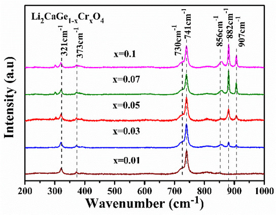 Figure 5 shows the Raman spectra of the Li2CaGe1−xCrxO4 (x = 0.01, 0.03, 0.05, 0.07, and 0.1) crystals, consisting of seven Raman peaks: 321, 373, 730, 741, 856, 882, and 907 cm−1. The first four Raman peaks (i.e., 321, 373, 730, and 741 cm−1) remained basically consistent and did not change with the increase in Cr4+ concentration. The two Raman peaks at 730 and 741 cm−1 were caused by the (GeO4)4+ tetrahedral n3 and n1 stretching modes. The peak located around 373 cm−1 was caused by the bending vibration of O–Ge–O bonds, while the peak at 321 cm−1 can be attributed to the tetrahedral GeO4 vibrations [32,33]. In addition, the intensity of the other three Raman peaks (i.e., 856, 882, and 907 cm−1) gradually increased as the Cr4+ ion doping concentration increased, showing that these three Raman peaks are related to Cr ions. The two Raman peaks located around 856 and 882 cm−1 correspond to the n1 and n3 vibration modes of the CrO4, which also proves that Cr4+ ions preferentially occupy the Ge4+ tetrahedron position in Li2CaGeO4 crystals. Finally, the Raman peak at 907 cm−1 belongs to the symmetric stretching vibration of CrO3 [34,35].