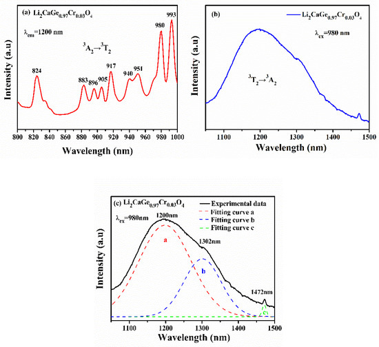 (a) Excitation spectra of Li2CaGe0.97Cr0.03O4 (λem = 1200 nm); (b) emission spectra of Li2CaGe0.97Cr0.03O4 (λex = 980 nm); (c) Gaussian-fitted spectrum of the emission spectra of Li2CaGe0.97Cr0.03O4 (λex = 980 nm).
