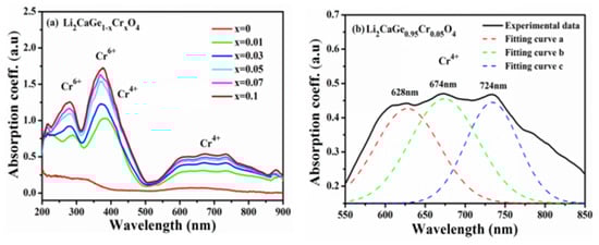 Li2CaGe1–xCrxO4 crystal absorption spectra: (a) Absorption spectra of crystals with different doping concentrations (200–900 nm); (b) the Gaussian of Li2CaGe0.95Cr0.05O4 (550–850 nm).