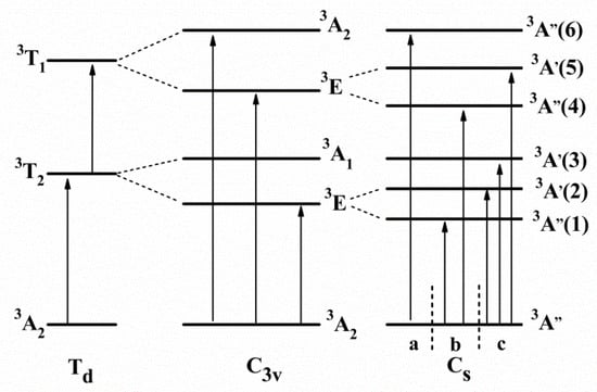 Figure 8 illustrates the energy level diagram of the Cr4+ ions for the two lowest high-spin terms, namely, 3T1 and 3T2. According to the Tanabe–Sugano diagram of the Cr4+ ions, in the ideal tetrahedral position of Td symmetry, the lowest free-ion level of the d2–Cr4+ ions is 3F. Due to the splitting of the crystal field, the free-ion level is split as follows: 3F→3A2 + 3T2 + 3T1. The energy order of these levels is as follows: 3T1 > 3T2 > 3A2. Generally, the 3A2 energy level can be considered to be a ground state and the 3A2→3T1 transition is an allowed electric dipole (spin-allowed), while 3A2→3T2 is an allowed magnetic dipole. Based on the structure of Li2CaGeO4, the local environmental symmetry is less than the Td symmetry, and the tetrahedron is distorted along the two axes, which splits the 3T1 and 3T2 bands into three components. The most probable chain of descent of symmetry is Td→C3v→Cs.