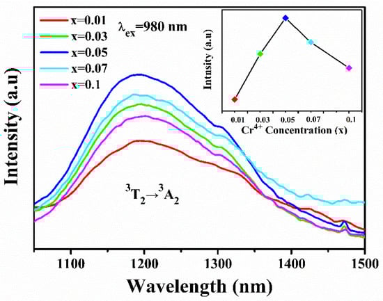 The dependence of the emission spectra on the Cr4+ doping concentration was investigated, and the results are shown in Figure 9. Here, the emission spectra of Li2CaGe1−xCrxO4 (x = 0.01, 0.03, 0.05, 0.07, and 0.1) with excitations of 980 nm at room temperature are characterized. When the Cr doping concentration increased from 1 to 5 mol%, the emission intensity monotonically also increased, reaching a maximum at x = 5 mol%. However, a further increase in the Cr4+ concentration (9 and 12 mol%) resulted in a reduction in emission intensity due to concentration quenching, which was caused by energy transfer between the Cr4+ ions. The experimental results indicate that the optimal Cr4+ ion concentration is 5 mol% in Cr4+–Li2CaGeO4. Generally, the energy transfer rate between luminescent centers increases with the number of active ions, and so does the energy transfer rate from the luminescent center to the traps nearby. The critical energy transfer distance (Rc) between the neighboring donors (activators) and acceptors (quenching site) can be expressed by Dexter’s theory [38] (Equation (2)):