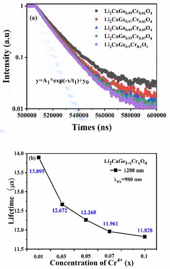 where I and I0 are the luminescence intensities with time t and 0, respectively, A is a constant, t is time, and τ is the decay time for the exponential components. According to the above fitting equation, the decay time of Li2CaGe1–xCrxO4 (x = 0.01, 0.03, 0.05, 0.07, and 0.1) is 13.895, 12.672, 12.268, 11.961, and 11.828 ms, respectively. The function of the lifetime of the Cr4+ ions at 1200 nm (3T2→3A2) and the concentration in Li2CaGeO4 is shown in Figure 11b. As the Cr4+ ion doping concentration increased, the fluorescence lifetime of the samples gradually decreased. This may be due to the increase in the doping concentration of the Cr4+ ions itself, which leads to an increase in the cross-relaxation between two adjacent Cr4+ ions. Generally, there are a number of reasons that can cause decay kinetics behavior, including the number of luminescent centers, energy transfer, and defect types. If the Cr4+ ions occupy different positions in the host lattice, different luminescent centers will be generated, resulting in multi-exponential behavior [43]. However, the fluorescence decay curve in the Li2CaGeO4 host is consistent with a single exponential behavior. This indicates that the Cr4+ ions have only one luminescence center in Li2CaGeO4 with the Cr4+ ions only occupying the position of the Ge4+ ions.