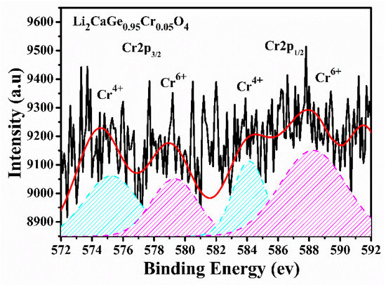 Figure 13 shows the narrow-scan XPS spectra of Cr2p3/2 and Cr2p1/2 for the Li2CaGe0.95Cr0.05O4 sample around the Cr2p core region. The narrow-scan spectra of XPS were fitted using Gaussian equations with two peaks centered at 575.6 and 584.4 eV due to Cr2p3/2 and Cr2p1/2, respectively, corresponding to the Cr4+ ions. In the Gaussian fitting curves, we did not find peaks of the Cr3+ ions, of which the two peaks centered at 577.0 and 586.7 eV were ascribed to Cr2p3/2 and Cr2p1/2 of the Cr3+ ions, respectively [44,45]. Therefore, the Li2CaGeO4 sample contained only Cr4+ ions without the presence of Cr3+ ions, which is consistent with the results of the fluorescence spectroscopy analysis. However, in the Gaussian fitting curve, we found two peaks centered at 579.5 and 588.9 eV from Cr2p3/2 and Cr2p1/2, respectively, corresponding to the Cr6+ ions [45]. This phenomenon occurred because Cr3+ ions can be oxidized not only into Cr4+ ions but also into Cr6+ ions at high temperatures, and Cr6+ ions exist in the form of CrO3 and are stable at room temperature.