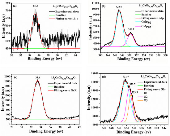 Figure 14 shows the XPS narrow-scan spectra of the other elements in the Li2CaGe0.95Cr0.05O4 crystals, where Figure 14a is the narrow-scan spectrum of the Li1s peak, Figure 14b is the narrow-scan spectrum of the Ca2p peak, and Figure 14c is the narrow-scan spectrum of the Ge3d peak. Meanwhile, the narrow-scan spectrum of Figure 14d is that of the O1s peak. As can be seen from Figure 12, there is only one broad peak at 55.3 eV in the narrow-scan spectrum of the Li1s peak, corresponding to the (+1) valence of Li ions, which is mainly formed by the Li–O bonds in the crystals. As can be seen from Figure 14b, in the narrow-scan spectrum of the Ca2p peak, there are two main peaks, namely, 347.2 and 350.3 eV, which belong to the Ca ions Ca2p3/2 and Ca2p1/2, respectively, corresponding to the (+2) valence of Ca ions mainly formed by the Ca–O bonds. It can be seen from Figure 14c that in the narrow-scan spectrum of the Ge3d peak, only the peak at 33.4 eV exists in the crystals, which belongs to the GeO4 structure; meanwhile, no peak of GeO2 can be found in the crystals, and so it can be inferred that the Ge element only exists in the form of GeO4 in the crystals. Figure 14d shows the main three fitted peaks of the O1s peak, located at 531.7, 532.7, and 533.5 eV, which belong to the Li–O, Ca–O, and Ge–O bonds, respectively [47,48,49,50].