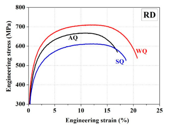 where h0 of 10 mm is the initial hole diameter and h1 is the final hole diameter immediately after the initiation of through-thickness crack. Previous works reported the inversely proportional HER–UTS relation, as remarked in Section 1. However, the present results showed the direct proportion between the two properties; the WQ specimen exhibited the highest HER value as well as UTS among the investigated steels, followed by the AQ and SQ specimens (Figure 3). Such a unique tendency will be discussed further in Section 4.